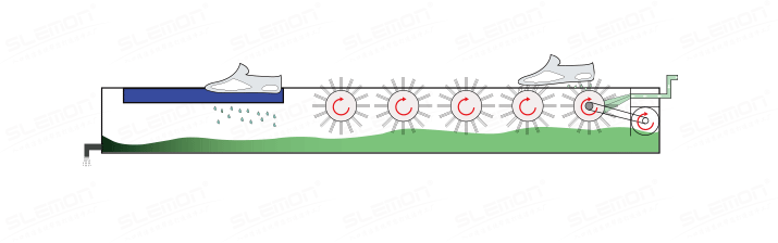 如圖中箭頭所示,使用人員從感應(yīng)器一方通過(guò),在清潔區(qū)域站立停留2- 3秒,此時(shí)刷浸水循環(huán)自行清潔并清潔鞋底;再通過(guò)吸干區(qū)停留1- 2秒經(jīng)過(guò)強(qiáng)力吸水棉,把鞋底水漬吸干后走下設(shè)備,完成整個(gè)清洗過(guò)程。如停留時(shí)間適當(dāng)增加,清潔效果更好。(如果置于風(fēng)淋室內(nèi),則不影響進(jìn)入時(shí)間,因風(fēng)淋室風(fēng)淋時(shí)間一般在10秒左右)。